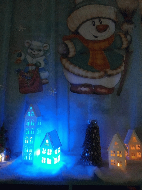 Группа "Совушки"представила жюри Дом Деда Мороза со множеством таинственных огней.Все продумано до мелочей:чтобы получилась сказка для малышей,педагоги спрятали гирлянду за вуалью и получился терем с огоньками!!!